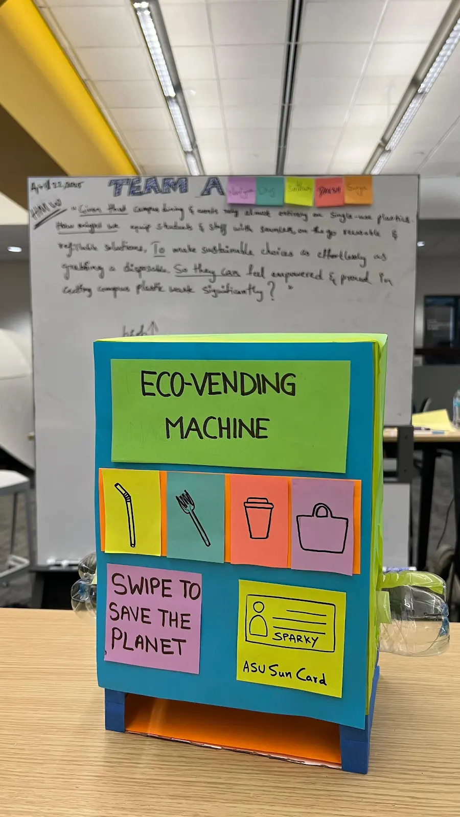 Every day on ASU’s campus, hundreds of single-use cups, containers, and utensils are tossed after one use, burdening landfills and choking our environment. Even students who want to use reusables face hurdles—there’s no easy way to borrow or return them between classes. Small frictions push people back to disposables, despite their best intentions. Our team built a tabletop cardboard model of an “Eco-Vending Machine” prototype: a bright, student-friendly kiosk that loans mugs, boxes, and cutlery with a simple swipe. By making reuse as seamless as getting a snack, we empower the campus community to choose sustainability every day.
